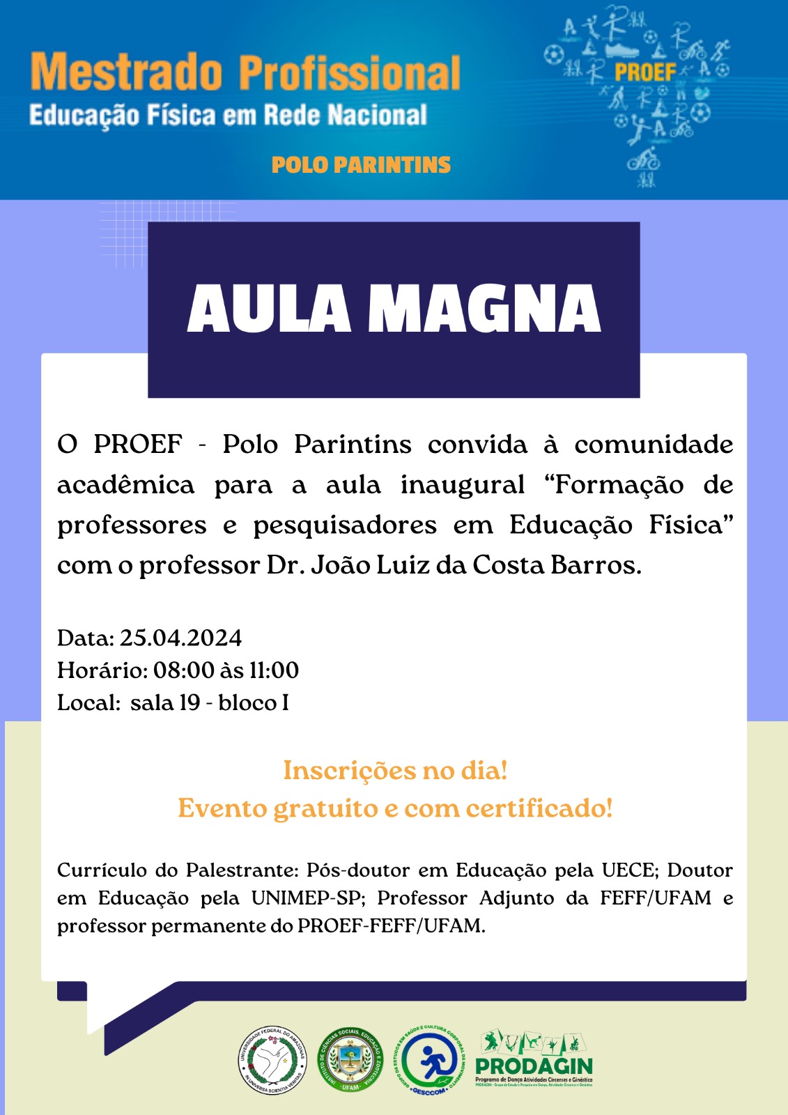 A coordenação do Polo Parintins do Mestrado Profissional em Educação Física em Rede Nacional (PROEF) convida toda a comunidade acadêmica e demais interessados a participarem da AULA MAGNA a ser proferida pelo prof. Dr. João Luiz da Costa Barros (FEFF/UFAM) com a temática: "Formação de professores-pesquisadores em Educação Física", contando com a presença da 1ª turma de mestrandos, composta por professores da rede básica de ensino de diversos municípios do estado do Amazonas.